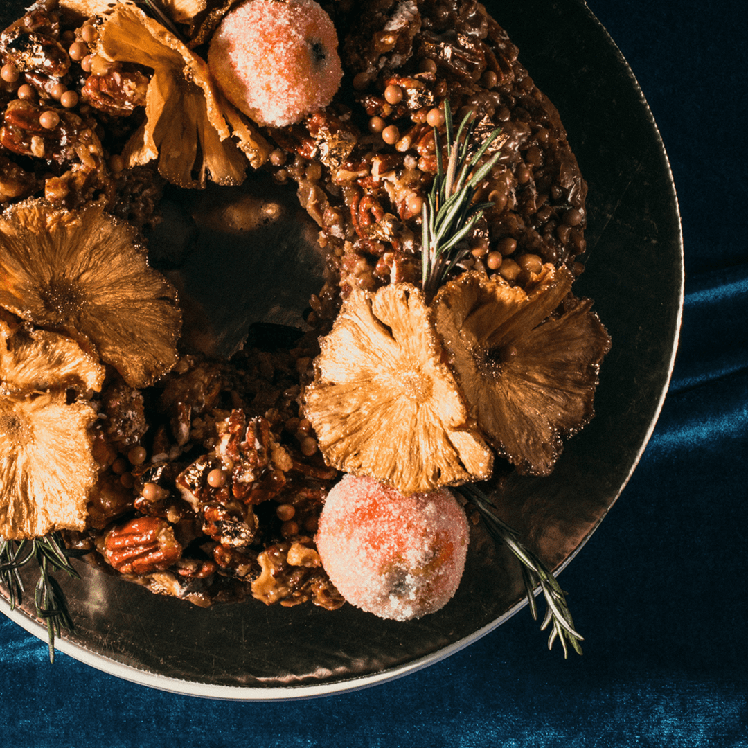 Horneada con coctel de fruta natural y bañado con un delicioso caramelo.